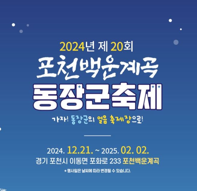 포천백운계곡 동장군축제는 경기도 포천시에 위치한 백운계곡에서 열리는 겨울 축제로, 많은 사람들에게 사랑받고 있는 이벤트입니다. 본 축제는 겨울철 자연의 아름다움과 다양한 즐길 거리를 제공하여 가족 단위 방문객에게 특히 인기가 많습니다. 올해로 제20회를 맞이하는 동장군축제는 2024년 12월 21일부터 2025년 2월 2일까지 진행됩니다. 이번 축제의 테마는 '얼음과 눈'으로, 겨울의 매력을 한껏 느낄 수 있는 프로그램들이 준비되어 있습니다.