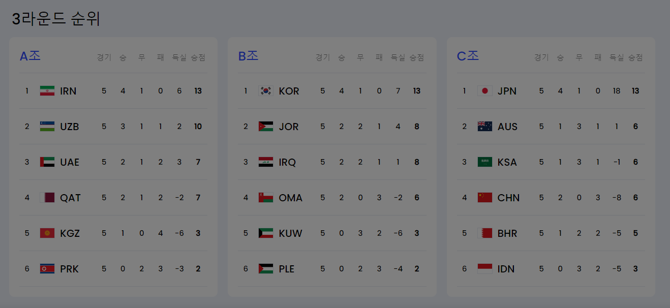 FIFA 월드컵 아시아 3차 예선: 전 경기 결과·순위